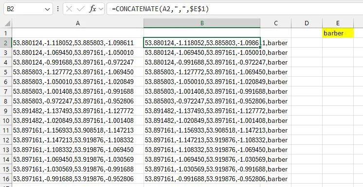 We are adding a comma, and then the search term. The dollar signs lock the cell to the formula. Autofill down your list of coordinates and you now have a list of boxes with search term that you can paste into Placefetch. Optionally you could add in a max box size too by including it in E1 (for example barber,5), or as part of the formula itself.