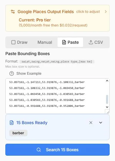 Copy the list of cells in column B into Placefetch in the paste window, click “preview boxes” and you are now ready to perform a search.